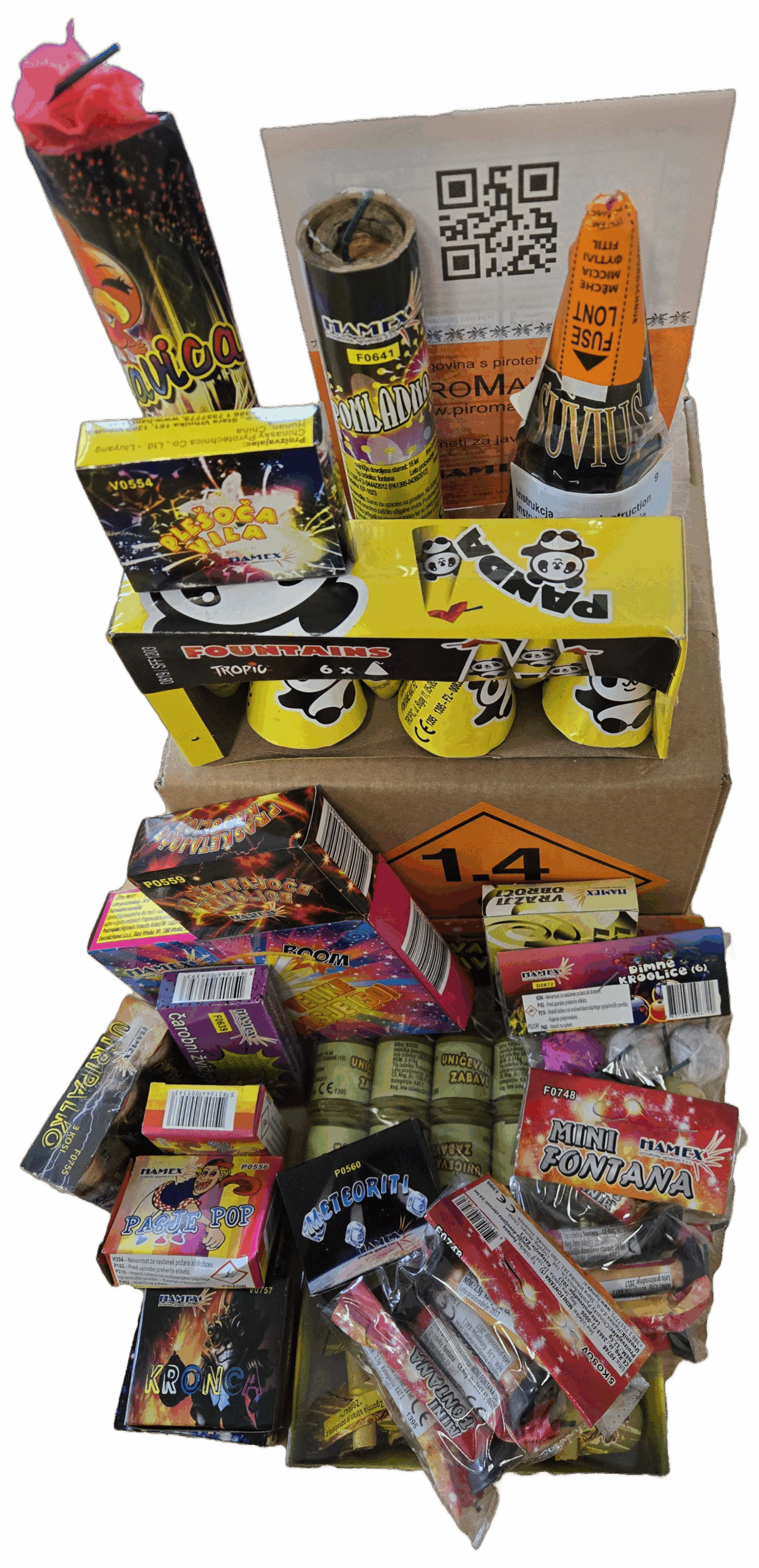 Vsebina: 1x Murmina13sh, 1x Panda vulkan (6), 1x Utripalko (3), 1x Kronca (3), 1x Čarobni žvižgači (10), 1x Dimne kroglice (6), 2x Mini fontana (5), 2x Pasje pop (50), 1x Kukavica, 2x Debelinko (3), 1x Plesoča vila (3), 1x Meteoriti (12), 1x torna fontana 12cm, 1x uničevalec zabave (12), 1x Prasketajoče kroglice (6), 1x Vesuvius 45sec, 1x Mini circo (6), 1x presenečenje; Slika je simbolična.