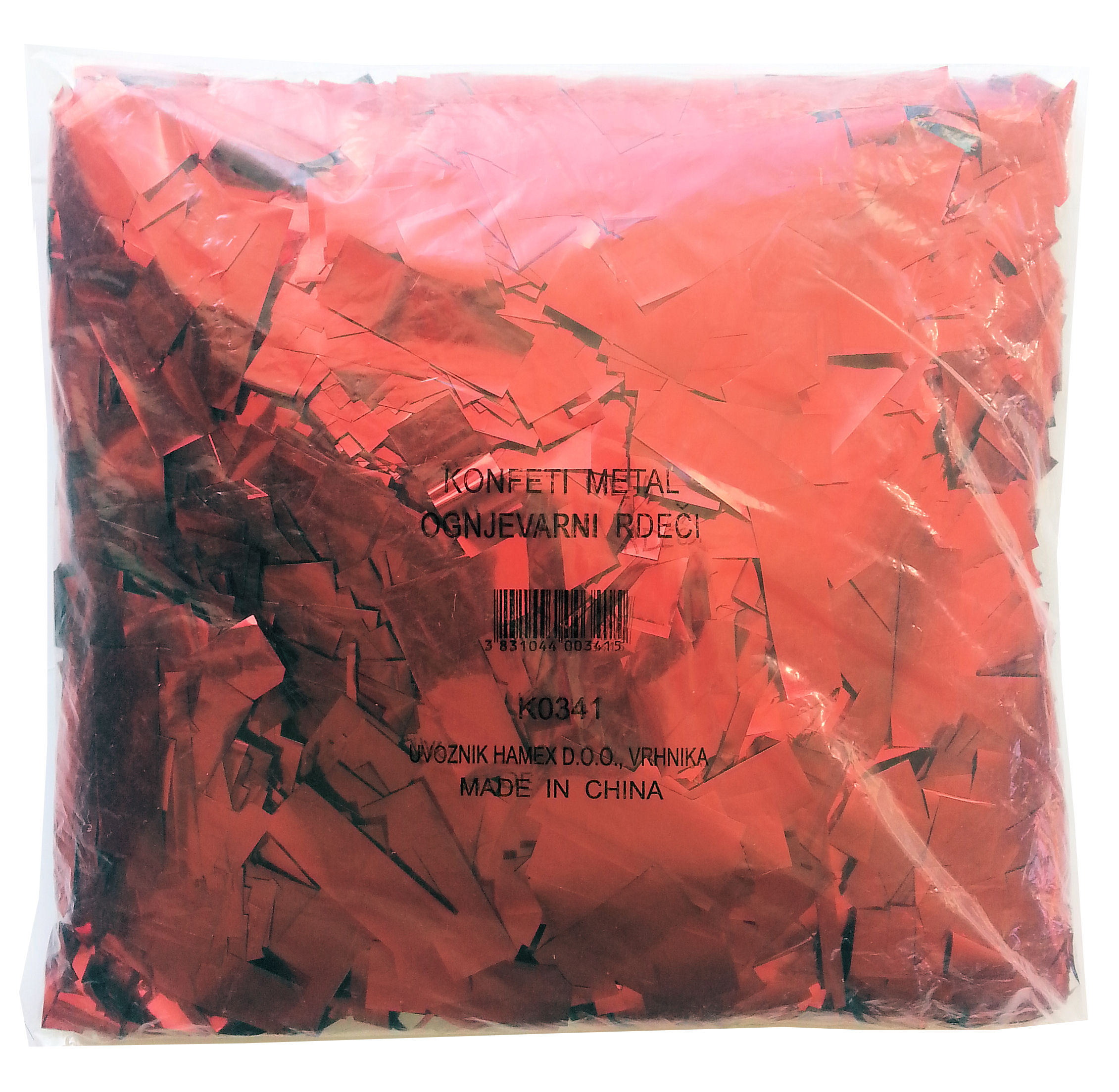 Konfeti metal, ognjevarni rdeči, pakiranje 1 kg, pravokotni lističi dimenzije 5,5×1,8 cm.