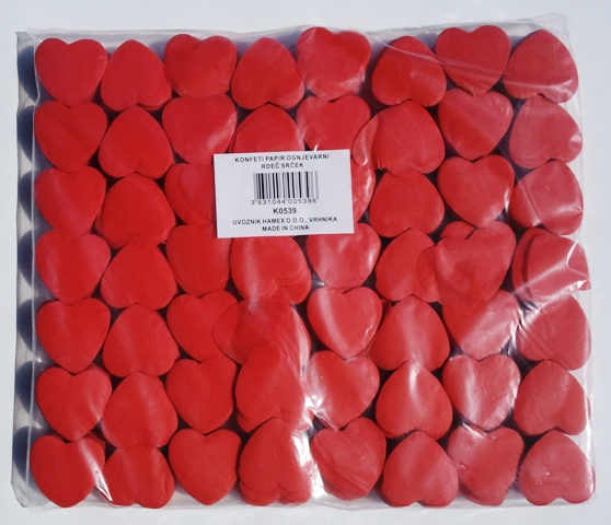 Konfeti papir, ognjevarni rdeč srček, pakiranje 1 kg, lističi v obliki srčka dimenzije 4,5 x 4,5 cm.