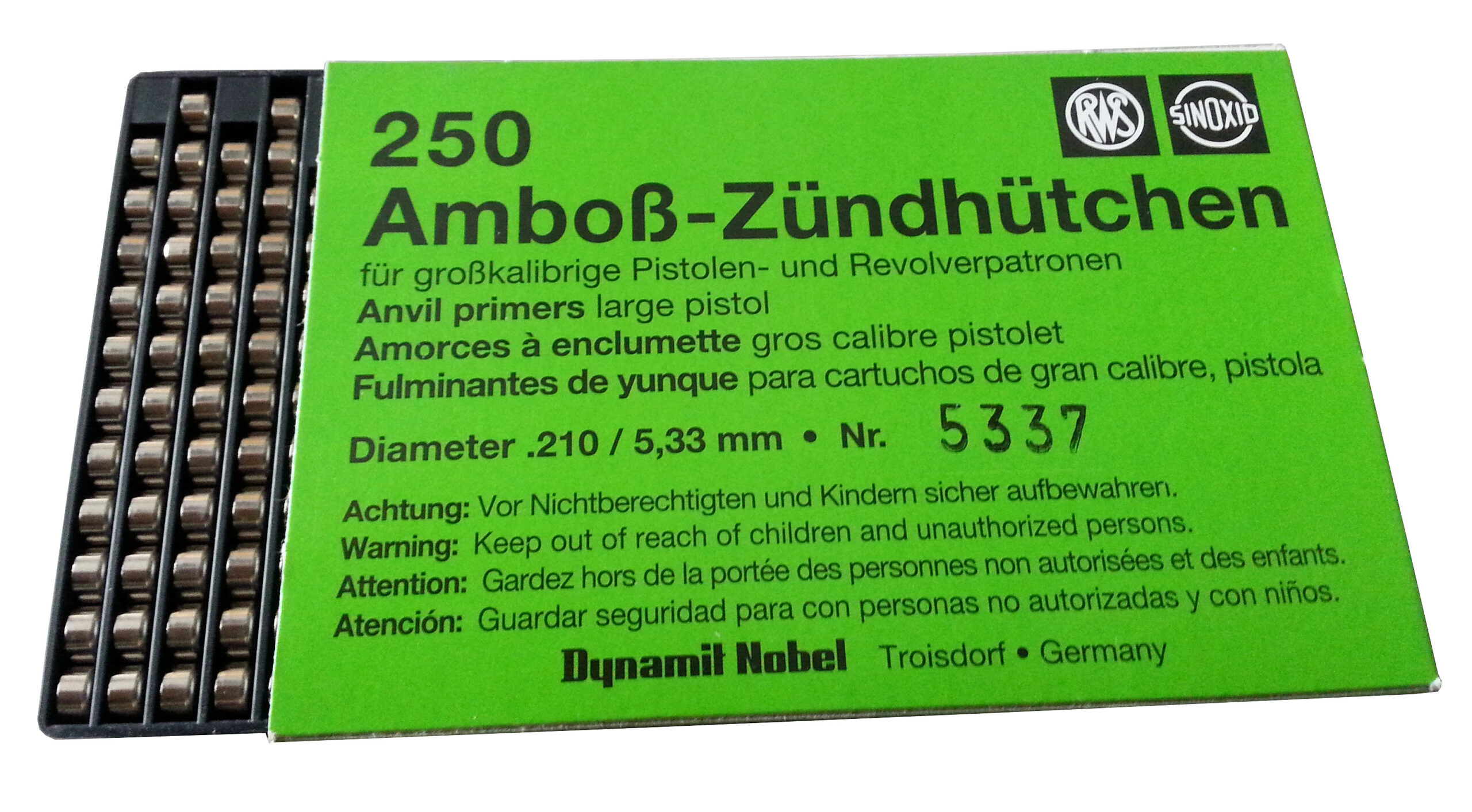 Za večje kalibre za pištole in revolverje. fi 5,33mm za kalibre: .45 Auto, 45 Colt, .44-40, .44 Mag, .41 Mag; pakiranje 250 kos ali 100 kos.