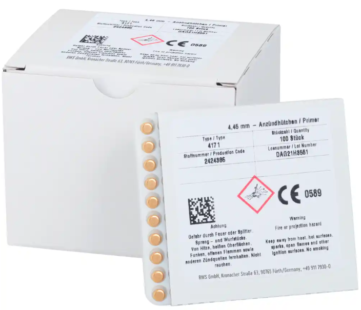 za male kalibre za pištolsko in revolversko strelivo, fi4,45mm. Za kalibre 6,35, 7,65, 9mm, .32, .38, .40, .357mag; pakiranje 100 kos