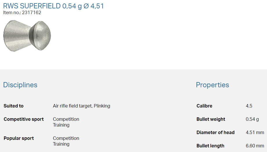 RWS SUPER FIELD je posebej zasnovan za zračne puške s tlačnimi cilindri. Ti zajetni krogli z okroglim nosom kažejo občudovanja vredno natančnost in zmogljivost, tudi na srednjih do daljših razdaljah streljanja.
