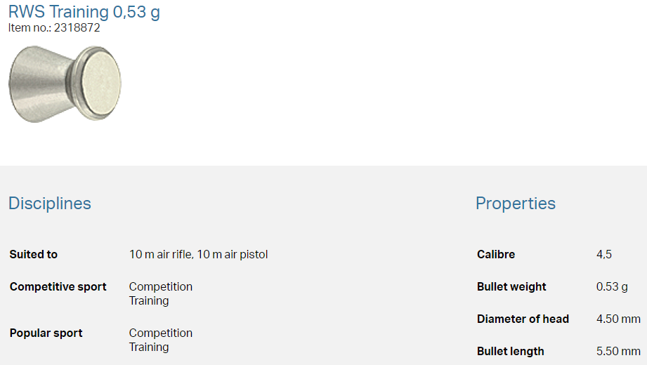 RWS TRAINING razširja linijo Sport z dodajanjem težke različice znane klubske pelete v gladki obliki. Je cenovno ugodna vadbena različica z enakimi balističnimi lastnostmi kot RWS Match in Meisterkugeln v enaki teži.
