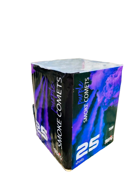 Vseh 25 strelov se izstreli naenkrat, prikaže se visok steber vijoličnega dima.
